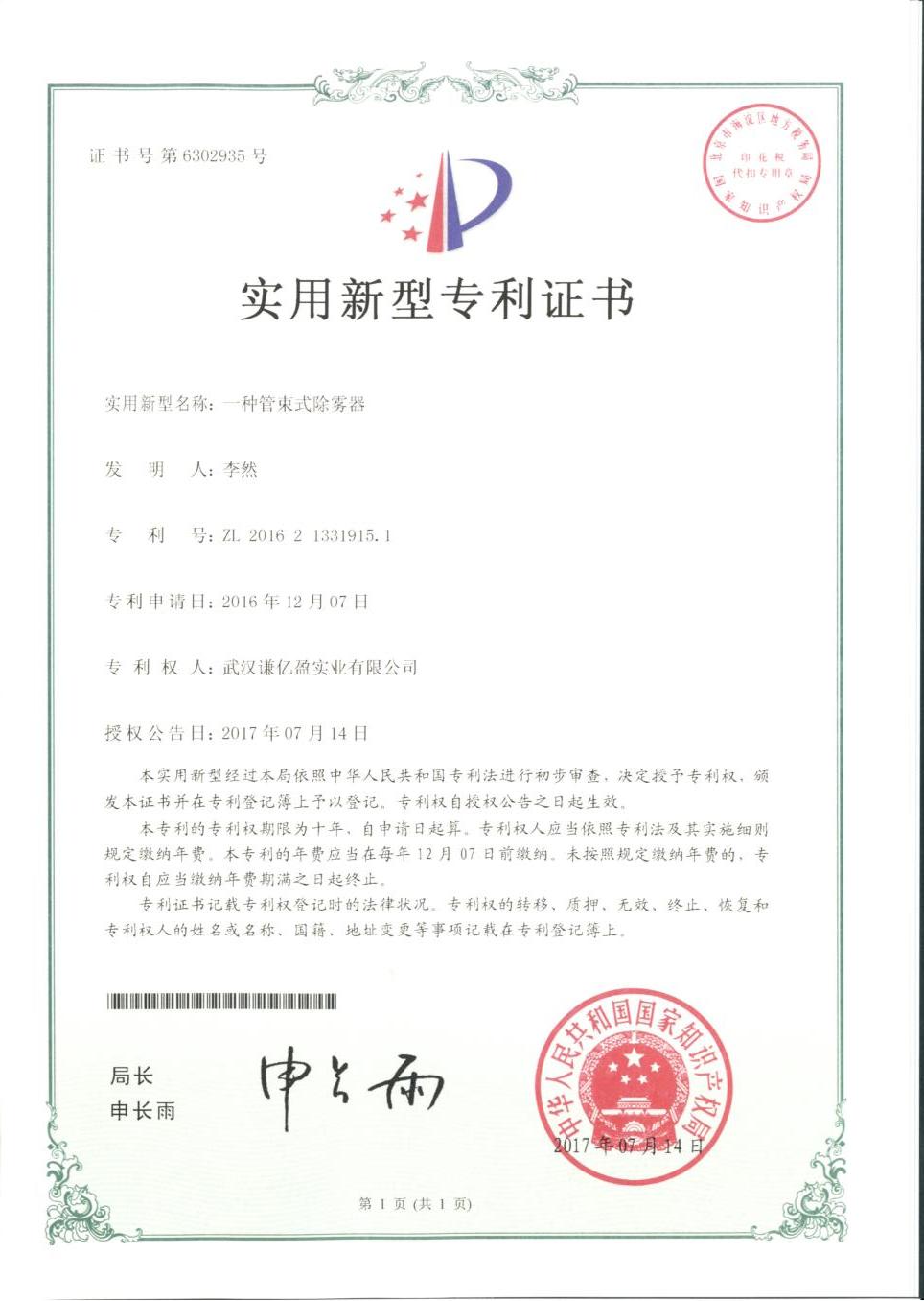 除雾器专利证书
